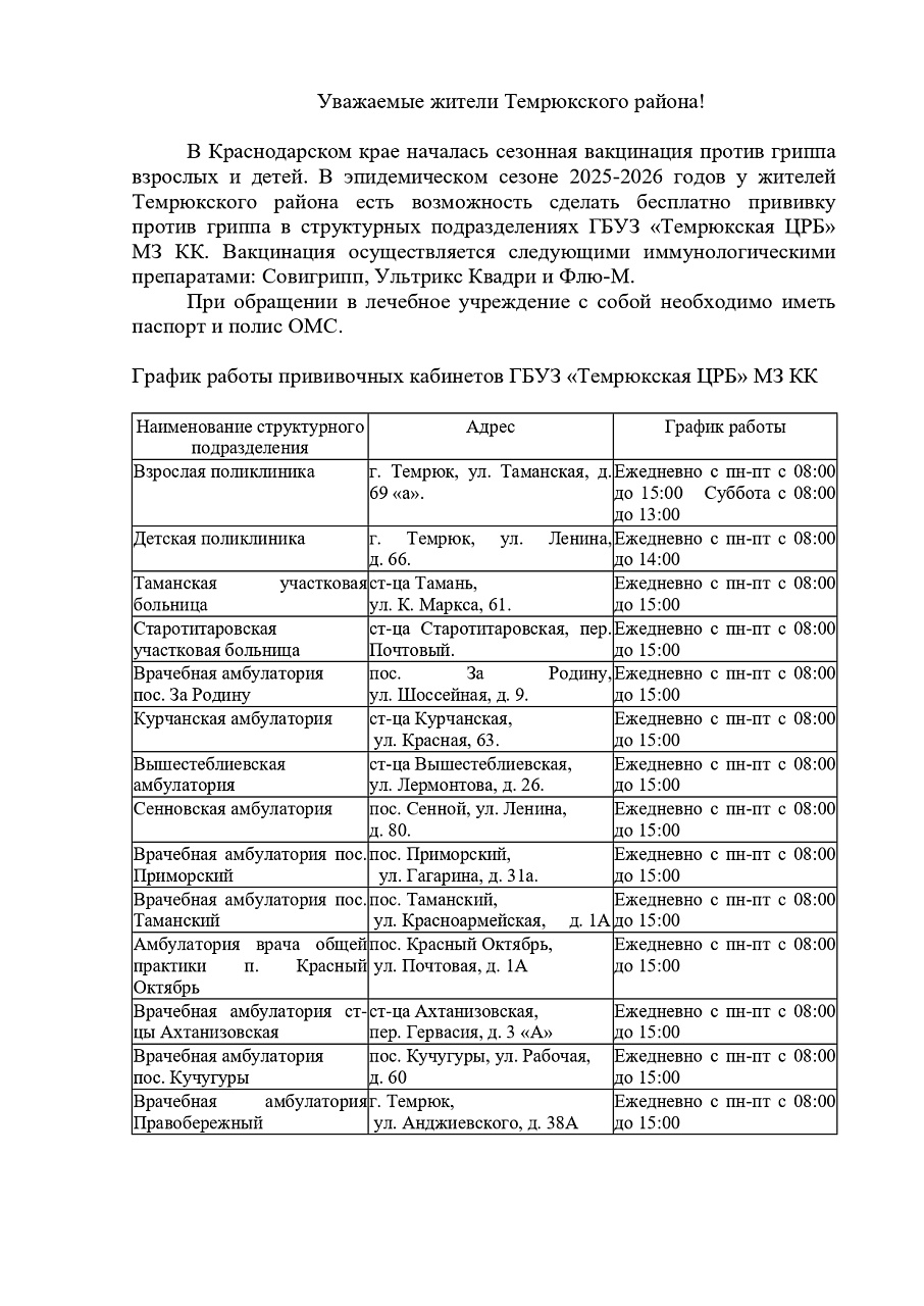 График работы прививочных кабинетов ГБУЗ «Темрюкская ЦРБ» МЗ КК