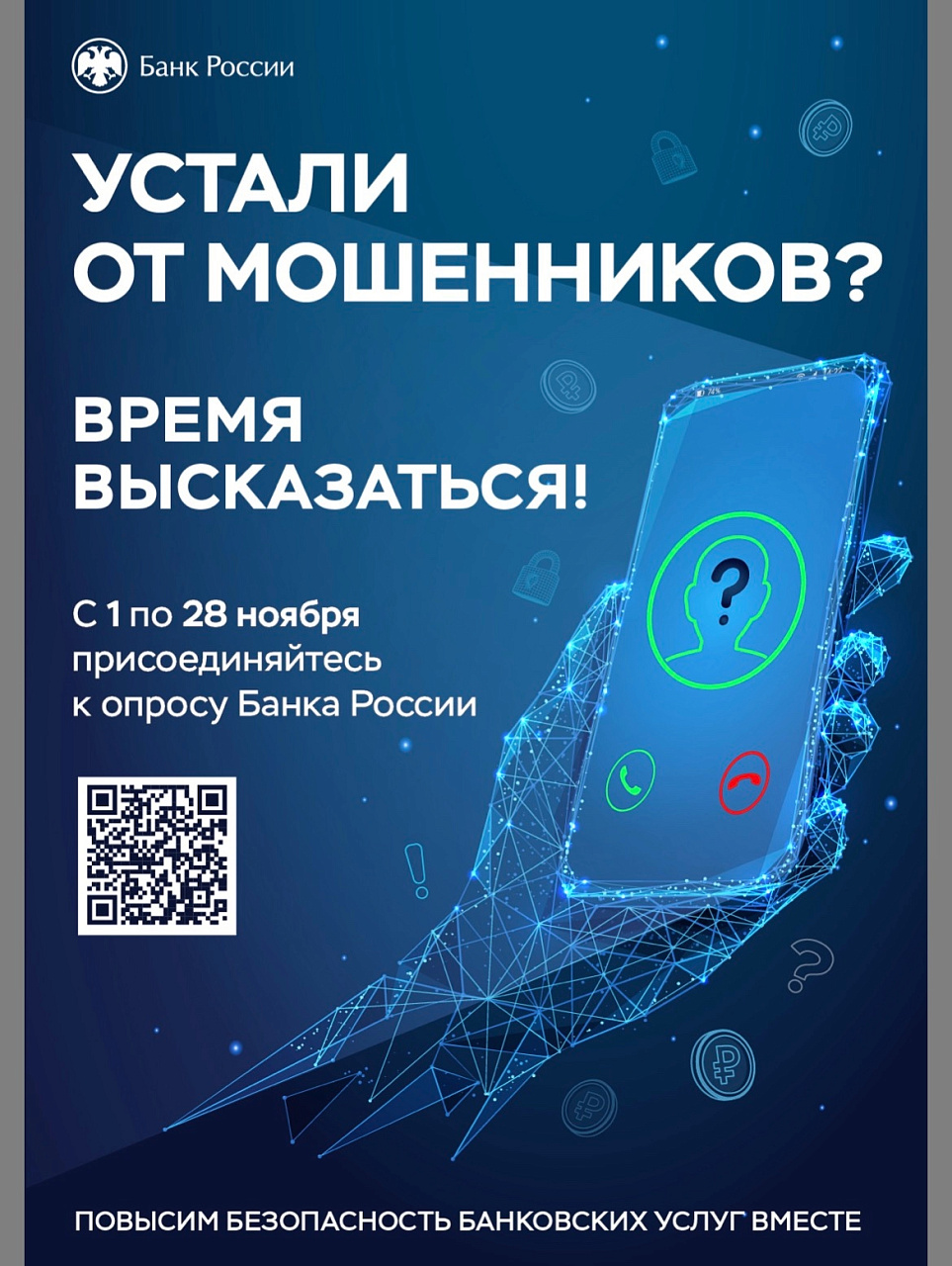 В целях повышения качества профилактической работы в области финансовой киберг-рамотности, направленной на снижение рисков хищений средств клиентов финансовых организаций – жителей Кубани, Банком России проводится опрос жителей региона по теме «Степень удовлетворенности населения уровнем безопасности финансовых услуг, оказываемых организациями кредитно-финансовой сферы»